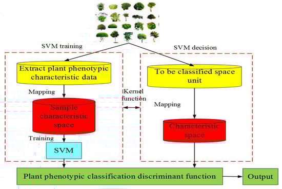 (3) Traditional machine learning-based PPIR mainly consists of artificial neural network, moving center hypersphere classifier, SVM, etc. [28]. Machine learning refers to a set of computerized modeling methods whose patterns are learned from data in order to automatically make decisions without explicit rules. The main idea of machine learning is to make effective use of experience or sample scenarios to discover the underlying structure, similarity, or difference in the data, so as to correctly interpret or classify new experience or sample scenarios [29]. It is important for programers to deploy specific machine learning approaches to their specific problems to make informed choices. The application of plant phenotype can be summarized into four aspects: (a) identification and detection, (b) classification, (c) quantification and estimation, and (d) prediction. In addition, data preprocessing steps, such as dimensionality reduction, clustering, and segmentation, can also be the key to a successful decision [29]. The moving center hypersphere classifier considers the sample points of plant phenotypic image data as a series of hyper spheres. A set of sample points are considered to be part of a hyper sphere, whose radius is expanded to include as many sample points as possible [26]. The SVM is a supervised learning model that is applicable to linearly or nonlinearly separable and a small number of samples. The method can be extended to high-dimensional pattern recognition by projecting the data points into a higher dimensional space and computing a maximum-margin hyperplane decision surface [26]. The SVM can be used to classify the plant phenotypic image data. Figure 3 shows its basic idea.