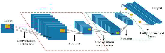 In Equation (2), represents the down sampling function. The CNN convolution and pooling operations are repeated according to the pre-defined number of network layers. After that, the processed feature vectors are stacked and classified while using the fully connected layer. Usually, the and SVM classifier functions are used for classification.