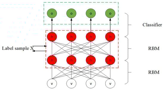 In the above Equations (4)–(7), h and v represent the recessive and dominant neurons, respectively, assuming that m and n represent the number of dominant and recessive neurons, respectively, the superscript represents the position of the corresponding layer, , represent the outputs from the first visible and hidden layers, respectively, and W is the weight that correponds to the connection between the layers. At the end of training, the classification of the input can be obtained by using the output of the last hidden layer. Figure 7 shows the overall structure of the DBN: