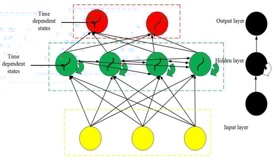 In Equations (8)–(10), and represent the and the neurons in the input and hidden layers at time t, respectively. The value of the neuron prior to the time instant t is given by , represents the neuron in the output layer at time t, represents the weight connecting the input and hidden layers, represents the weight between the hidden layers, represents the weight between the hidden and output layers, and represents the nonlinear activation function. The RNN has good dynamic characteristics and it can be generally divided into Jordan-type and Elman-type networks, where the former type belongs to the category of forward neural network with a local memory unit and local feedback connection. Figure 9 shows a typical RNN structure: