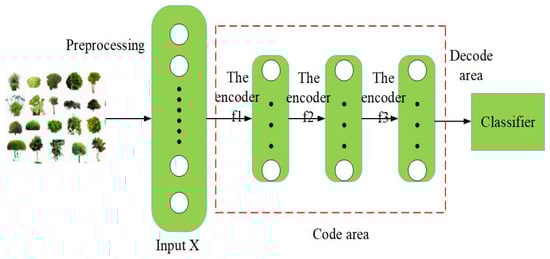 In Equation (11), X is the input data, W and U are the encoding and decoding weights, respectively, is the nonlinear activation function, is defined according to the requirements, and represents its weight. The SAE adopts deep feedforward neural network architecture, and the adjacent layer learning strategy is implemented by constructing the network in the form of a stack. In the image classification and recognition problem, the SAE is usually composed of two modules: feature learning and classifier. The general mathematical expression of a feature learning model is shown, as follows [69,70]: