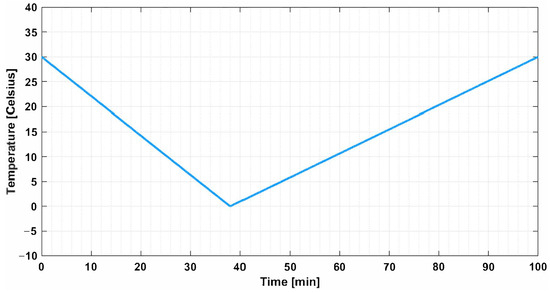 The revolution behavior of the LEO satellite results in regular and predictable temperature changes;Exposure to the sunlight heats up the system temperature during the sunlight period. Conversely, it cools down during the eclipse period. As a result, satellites orbiting around the Earth, experience extremely varying ambient temperature depending on a presence or absence of sunlight. This behavior is also confirmed in other small satellite systems [20]. As the ambient temperature is different depending on the architecture or configuration of designed satellite, we borrow the ambient temperature model from the work of Lee et al. [17] which is illustrated in Figure 1. They assume the ambient temperature varies linearly within [0 °C, 30 °C) for which the eclipse period (between and ) and the sunlight period (between and ) last. This can be formulated as follows: