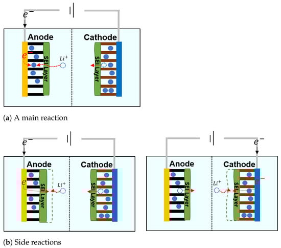 Kwak et al. [6] also used an electro-chemical model for the lifetime estimation of Li-ion batteries, based on two aging factors: Solid Electrolyte Interface (SEI) growth and active material loss.SEI refers to a compound layer which is formed as a result of a side reaction. That is, when lithium ions do not participate in the main reaction as depicted in Figure 2a, i.e., charging/discharging, for any reason, but are involved in unintended side reactions, a solid layer is accumulated either at the Anode or at the Cathode side as illustrated in Figure 2b. The other factor is the active material loss, which is gradually caused by mechanical stress induced by volume and structure changes [27]. Since Li-ion battery produces current by means of the movements of lithium ions, the loss of lithium ions that participate in the main reaction directly indicates a reduced battery capacity [28].