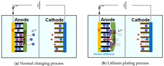 The lithium plating is observed when the battery is charged at a low temperature [30]. In a normal charging process, lithium ions intercalate into anode as depicted in the Figure 3a. However, if the battery temperature is considerably low, diffusion at the anode side is slowed down resulting in the accumulated lithium ions at the surface of anode, as illustrated in the Figure 3b. This, in turn, causes the reduction of available lithium ions, and thus the capacity of the battery. Furthermore, it can also result in a dangerous consequence when the plated lithium induces an internal short circuit.