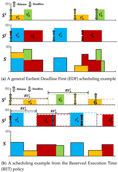 Then, at run time, as a second step, it chooses a task to be scheduled next using a conventional real-time scheduling policy, e.g., Earliest Deadline First (EDF). If task is chosen for a subsystem in this step at time t, this task is said to be reserved for the subsystem at time t and the time range is occupied by , i.e., no other tasks can be executed in this range.