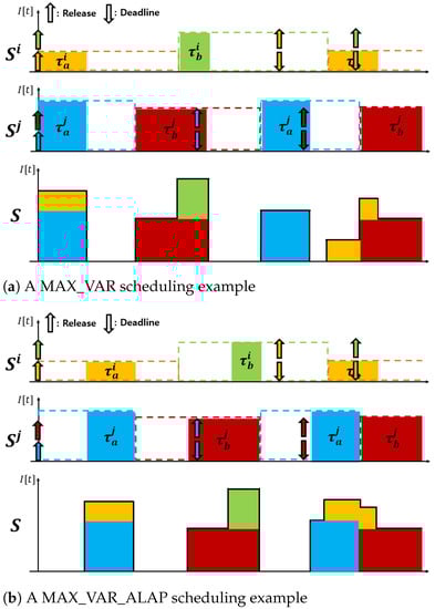 Based on empirical observations of the optimal temperature derived by Waldmann et al. [32], unlike the RET framework, we argue that the reduced heat generation is not beneficial to the battery lifetime in the satellite systems when they operate mostly at low temperatures. Hence, we take alternative approaches for the on-line scheduling decision. The first alternative, called MAX_VAR, is to find a starting time for each task with in its reserved time that simply maximizes the sum of current dissipation as shown in Figure 5a. In the example, the tasks are reserved in the order of , , , , and so forth. It can be seen that and are determined to be overlapped in time with and , respectively, to maximize the variance. However, this approach inevitably causes idle time slack post-fixed to the actual execution in most cases. Due to this, some chances of overlapping remain out of consideration. For example, as the second job of is scheduled at the beginning of its reserved time, the second job of will never be able to be executed at the same time with . To compensate for these lost possibilities of overlapping, we propose the second alternative, referred to as MAX_VAR_ALAP, which also searches for the starting time that maximizes the variance, but keeps the schedule as late as possible. As illustrated in Figure 5b, this approach allows and to be overlapped in time for their second jobs too.