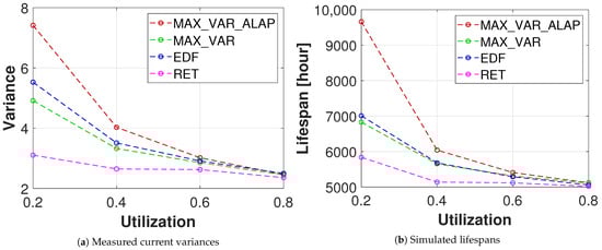 Figure 6 illustrates the measured current variances and the simulated lifespans that four different scheduling policies result in for the four different randomly generated task sets.As shown in Figure 6a, the RET policy always causes the minimal current variance.On the other extreme, MAX_VAR_ALAP shows the highest current variances over the all four cases. It increases the variance up to 238.73% from RET and up to 34.14% from EDF in the case of . These gaps gradually decrease as the utilization grows bigger (the degree of freedom in scheduling gets smaller). As analyzed with an example in Section 4.3, MAX_VAR could result in sub-optimal scheduling in terms of variance. This becomes evident when comparing the measured variances of MAX_VAR and MAX_VAR_ALAP. It sometimes results in even smaller variance than EDF and this implies that the slacks caused by the reserved time may work against the prolonged battery lifetime.