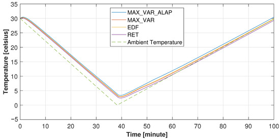 The simulated lifespans reported in Figure 6b show the same tendency as the variance. Comparing the lifetime caused by MAX_VAR_ALAP with that of RET, an improvement of 65.51% is achieved in the case of . For the other utilization points, , the expected lifespan gain are lesser, 17.54%, 5.67%, and 1.99%, respectively, as the degree of freedom in scheduling diminishes. This results prove that, on the contrary to the conclusion of the RET framework [6], the increased current variances can actually extend the lifespan of batteries in the satellite systems. This anomaly is attributed to the fact that the heat generation due to such increased variance can mitigate the lithium plating effect for satellite systems when they operate in low temperatures. Note that other aging effects may be accelerated in this case. This results can be verified in the battery cell temperature profile obtained by the simulator. The internal cell temperature profile reported by the simulator for the case of is illustrated in Figure 7. As expected, MAX_VAR_ALAP always generates more heat than other policies and the the RET policy shows the lowest temperature throughout the entire revolution period. The minimum cell temperature was observed to be 3.35 °C when the tasks are scheduled by the MAX_VAR_ALAP policy, while it was 2.45 °C for the RET policy.