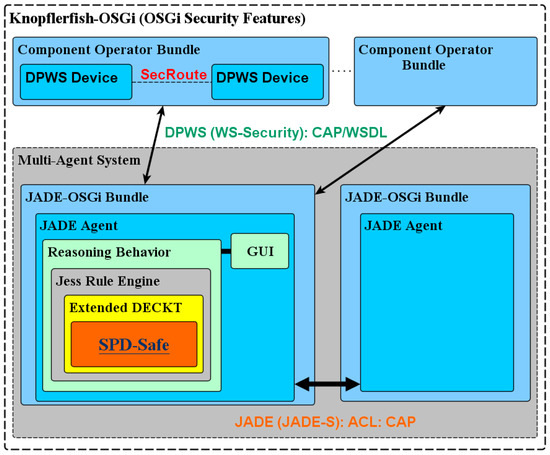 SPD-Safe utilizes JADE [64] as the top-layer multi-agent system. It adopts and implements standardized approaches to agent deployment, such as the ACL [41] by FIPA. The JADE-S add-on [65,66] safeguards communication at the overlay and offers built-in security functionality for confidentiality, integrity, authentication, and authorization.