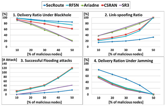The secure network communication link of SPD-Safe is compared with the five most relevant proposals for protecting WSNs. Simulation analysis has been performed in the Network Simulator 2 (NS2: http://www.isi.edu/nsnam/ns/), analyzing the performance of each scheme and the provided protection level on a medium-size WSN with 50 nodes [62]. Four attack cases are considered for blackhole, ballot-based attacks for link-spoofing, topology- and energy-aware attacks, and jamming. For each setting, several experiments have been conducted, with the attackers’ participation in the network ranging from 10–50%. Figure 3 presents the evaluation of the simulation results. SecRoute counters the attacks and outperforms the relevant schemes, providing the highest level of security and demonstrating the best energy- and load-balancing characteristics.