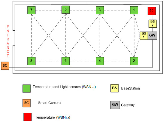 Within the ever-changing technological landscape, there is currently a move from automated to intelligent cyber-physical systems (CPS), motivated by the speedy infiltration of the Internet of Things (IoT) and cloud computing and enabled by wireless networking [19,20,21,22]. Wireless sensor networks (WSNs) [23] can cover the wide railway operational territory, gathering and processing pieces of ambient knowledge, while gateways can be used to transmit the data to the controlling center or a cloud service. The railway controlling software at the backend can, then, collect and integrate the spatial information and manage the underlying subsystems [24,25]. Therefore, WSNs are an ideal solution for covering the railway operating area, including the railway routes and various scattered shelters.