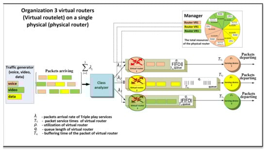 A future internet network with virtualization is a network in which one or more network devices use a virtualized mode of operation. Virtualization of a network device involves the creation of two or more virtualized network machines that act as a router with individual flowing services. In this case, in order to simplify the formalization of the virtual router model, we considered the transmission of three types of services so-called triple play services (voice, video and data). Accordingly, when designing the structure of a network device with virtualization, three virtual routers are deployed, which are designed to individually serve flows of the same type, providing them with the necessary level of QoS in accordance with the requirements (Figure 1). This is ensured by allocating physical hardware device resources to change the required performance of virtual routers serving flows (voice, video and data).