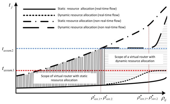 In static allocation, a dedicated virtual router gets a small fraction of each resource and cannot ask for more, even if it is needed. Paper [26] addresses the issue of node allocation in a virtualization network. It was investigated that this allocation should be dynamic to ensure better performance and optimal use of the physical infrastructure. As a result, it is possible to minimize the packet processing latency that occurs when multiple isolated virtual networks use limited resources on a single physical node. Queuing theory provides an interesting mathematical tool for managing queuing problems [27]. It also provides a good model for analyzing a physical router where a packet must be processed by multiple pipeline resources from the router’s input port to the output port.