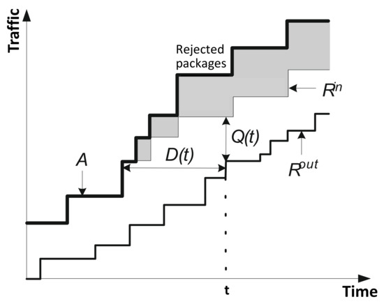 From formula (4), the difference between the arrival curve and the input curve is the volume of rejected traffic. The output curve characterizes the transmitted traffic during time interval and is defined as