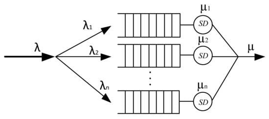 A network device with virtualization according to MSS can be represented by the cascading inclusion of buffer memory and serving devices (SD) (Figure 4). Thus, the traffic behavior of a multiservice IP network is characterized by different distribution laws, and therefore, when a network device is virtualized, each virtual router operates with its own class of services, each of which is described by the corresponding packet interval distribution function and service duration distribution function.