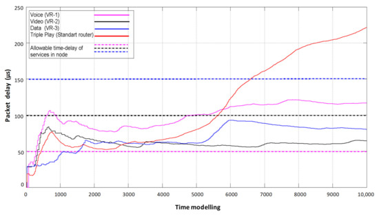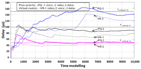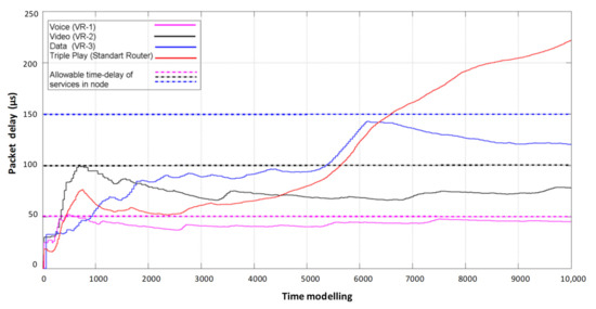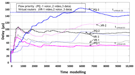 Figure 6 shows the delays occurring on each of the virtual routers when serving its type of traffic. Accordingly, each of the flows has its own allowable duration of a packet staying in the node, depending on the sensitivity of the service to latency according to IT-UT recommendations.