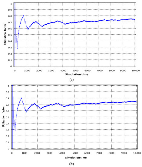 As can be seen in Figure 7b, the utilization factor of the virtual router when serving voice traffic decreased from 0.9 (static virtualization) to 0.7 (dynamic virtualization). This is explained by the fact that with dynamic allocation of computing resources, the performance of the virtual router, which processes voice traffic, has increased due to the fact that the intensity of traffic servicing by the device has increased, by allocating a larger access time window to the router’s CPU space. Accordingly, this situation leads to a decrease in the performance of the virtual router dedicated to data flow. With the same load on the virtual router serving device (data flow), the allocated CPU usage time in dynamic virtualization is less compared to static virtualization. Therefore, the load factor of the virtual router when serving the data flow increased from 0.75 to 0.85 (Figure 7c). Service device loading of the physical router with Triple Play flows is depicted in Figure 8. The impact of virtual router buffer utilization during dynamic virtualization is shown in Figure 9 and physical router utilization in Figure 10.