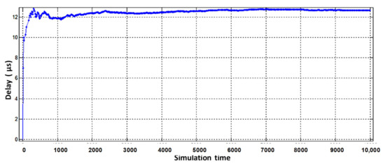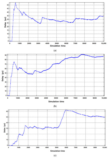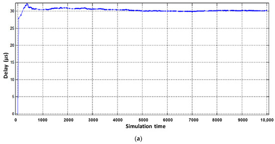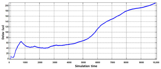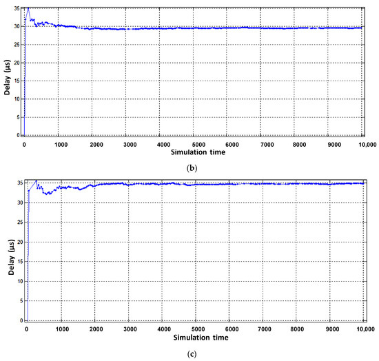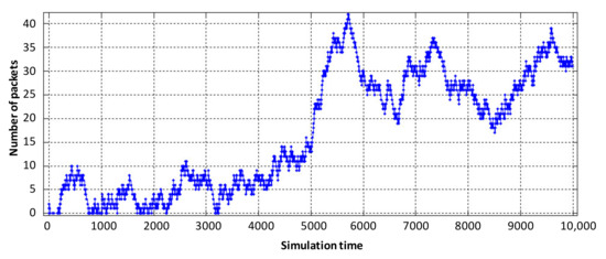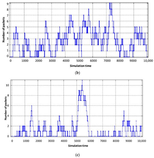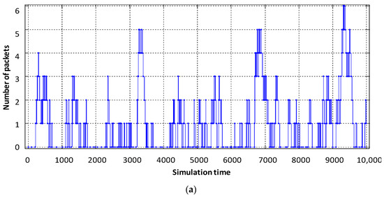 From the obtained results it can be seen that the average number of packets in the buffer of the virtual router, designed to serve voice flows, decreased from six to three (Figure 9b). The obtained result is explained by the fact that the intensity of packets serviced by the virtual router when servicing voice traffic has increased. However, for the other two virtual routers, the average number of packets in the buffer increased by 2–3 packets (Figure 9a,c). The delay caused by buffering is shown in Figure 11 and Figure 12.