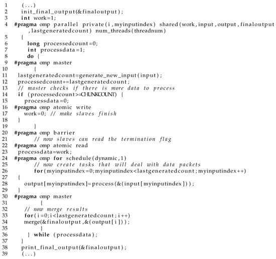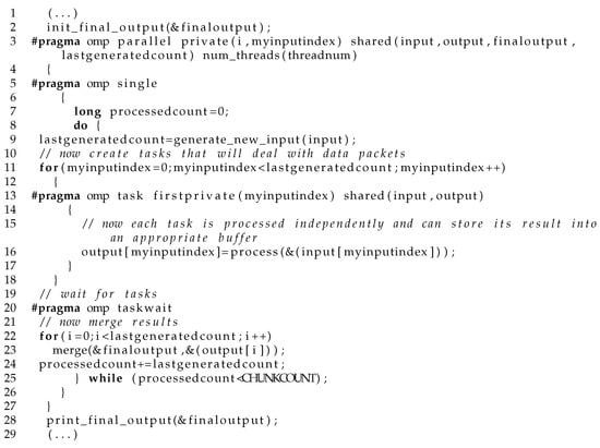 - dynamic-for (Figure 4)—this version is similar to the tasking one with the exception that instead of tasks, in each iteration of the loop a function processing a given input data packet is launched. Parallelization of the for loop is performed with #pragma omp for with a dynamic chunk 1 size scheduling clause. Upon completion, output is merged, new input data is generated and the procedure is repeated.