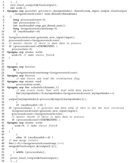 Figure 4. Dynamic-for implementation. - dynamic-for2 (Figure 5)—this version is an evolution of dynamic-for. It allows overlapping of generation of new data into the buffer and merging of latest results into the final result through assignment of both operations to threads with various ids (such as 0 and 4 in the listing). It should be noted that ids of these threads can be controlled in order to make sure that these are threads running on different physical cores as was the case for the two systems tested in the following experiments.