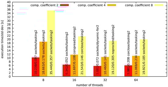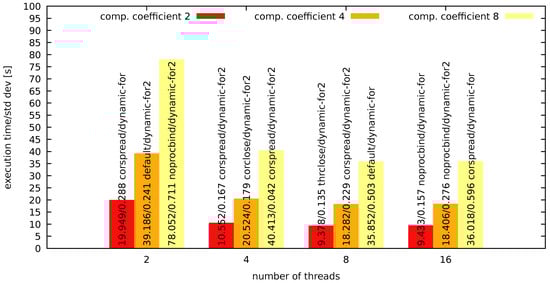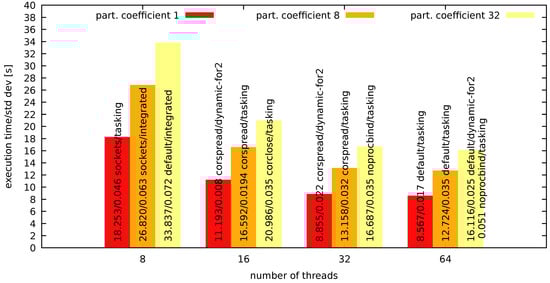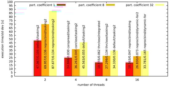 The following combinations of tests were performed: {code implementation} × {range of thread counts} × {affinity setting} × {partitioning coefficients: 1, 8, 32}. The range of thread counts tested depends on the implementation and varied as follows, based on preliminary tests that identified the most interesting values based on most promising execution times, where means the number of logical processors: for designated-master these were , , and , for all other versions the following were tested: , , and . Thread affinity settings were imposed with environment variables OMP_PLACES and OMP_PROC_BIND [27,28]. Specifically, the following combinations were tested independently: default (no additional affinity settings) marked with default, OMP_PROC_BIND=false which turns off thread affinity (marked in results as noprocbind), OMP_PLACES=cores and OMP_PROC_BIND=close marked with corclose, OMP_PLACES=cores and OMP_PROC_BIND=spread marked with corspread, OMP_PLACES=threads and OMP_PROC_BIND=close marked with thrclose, OMP_ PLACES=sockets without setting OMP_PROC_BIND marked with sockets which defaults to true if OMP_PLACES is set for gcc (https://gcc.gnu.org/onlinedocs/gcc-9.3.0/libgomp/OMP_005fPROC_005fBIND.html (accessed on 16 April 2021)). If OMP_PROC_BIND equals true then behavior is implementation defined and thus the above concrete settings were tested.In the experiments the code was tested with compilation flags -O3 and also -O3 -march=native. Best values are reported for each configuration, an average value out of 20 runs is presented along with corresponding standard deviation.