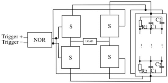 Topology of the serial asymmetric H-bridge generator. Each block marked with S represents one switch presented in Figure 2 marked with a striped line. Logical gates NOR at the input ensure only one trigger pulse at a time. To generate asymmetrical bipolar pulses two galvanically separated DC links are connected diagonally to the H-bridge.