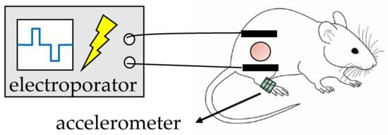The design of the animal experiments. The accelerometer was attached to the right hind foot of the mouse with adhesive tape. Electric pulses were generated by a newly-developed prototype device and delivered to the tumor on the right flank of the mouse by parallel plate electrodes.