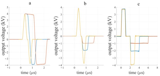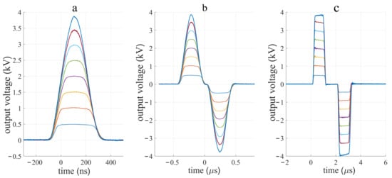In Figure 5 symmetric and asymmetric pulse generation is presented. The pulse duration of a positive and negative polarity can be set independently from 200 ns (Figure 5a) to 1 ms. Similarly, pulse amplitude of negative and positive polarity can be set independently (Figure 5b,c). In Figure 5a the capacitor charging voltage was set to 4 kV and trigger pulse duration was set to 260, 400, and 800 ns for both polarities. With the two longer pulse durations, the pulse amplitude comes close to 4 kV and the pause between both polarities is reduced. In Figure 5b,c the amplitude of the first polarity was the same (4 kV) and trigger duration 260 ns (Figure 5b) or 1 μs (Figure 5c). Charging voltage of the second polarity (4 kV, 2 kV and 1 kV), and the trigger duration (260 ns, 400 ns, and 800 ns (Figure 5b) or 1 μs, 2 μs, 4 μs in Figure 5c) were changed. Figure 5 demonstrates that the minimum pulse duration and highest amplitude of the first polarity have good repeatability and can be followed by the pulse of opposite polarity of any pulse duration or amplitude within the operation range.