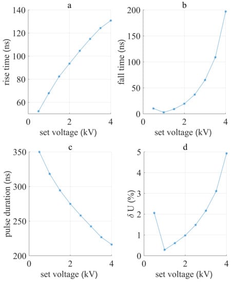 The monopolar pulse measurements from Figure 4 were further studied in detail. The rise and fall time, pulse duration, and relative error in amplitude U were calculated for each set voltage (Figure 6). As expected, both the rise and fall time of the pulse rises with set voltage. However, the maximal rise and fall time are below 150 ns that allows the generation of pulses with a minimum pulse duration of 200 ns at a maximal set voltage. At lower voltages, 200 ns pulse duration can be achieved by trigger pulse calibration. The maximal relative error in pulse amplitude is 5% which meets the desired performance.
