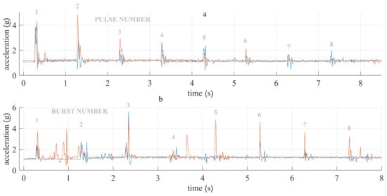 The absolute acceleration measured by an accelerometer attached to mice leg: (a) “classical” ECT pulses, (b) high-frequency ECT pulses. Blue and orange represent two individual measurements. Some noise is present in the pause between pulses, which was most likely caused by the person holding the mice and electrodes.