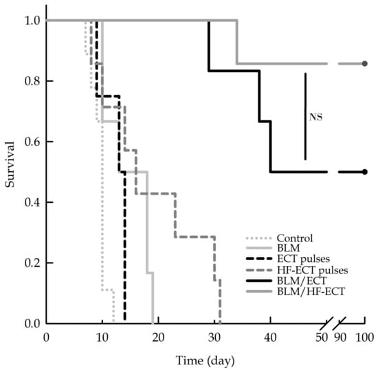 Survival of animals treated with “classical” and high-frequency ECT. Control (without treatment), chemotherapy with BLM, treatment with “classical” electroporation pulses (ECT pulses) or HF-EP pulses (HF-ECT pulses), with BLM using “classical” electroporation pulses (BLM/ECT) or HF-EP pulses (BLM/HF-ECT). The difference between BLM/ECT and BLM/HF-ECT is statistically not significant.