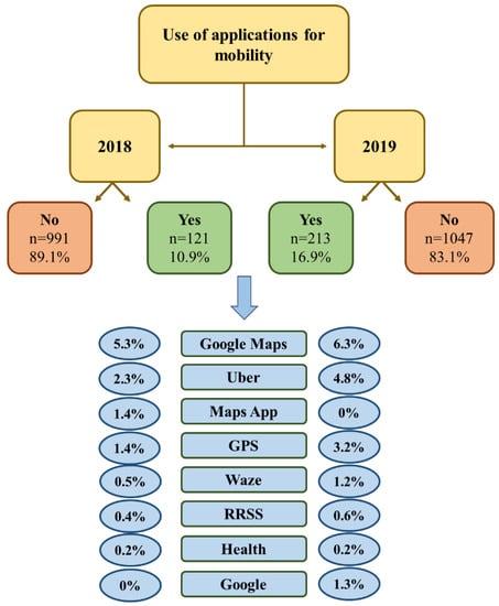 Regarding the application of these services for mobility, during both years their use was relatively scarce, even though there was a significant increase in 2019 in comparison with the previous year (Table 4). Figure 2 shows the most used apps, among which those related to navigation, maps and routes particularly stand out.