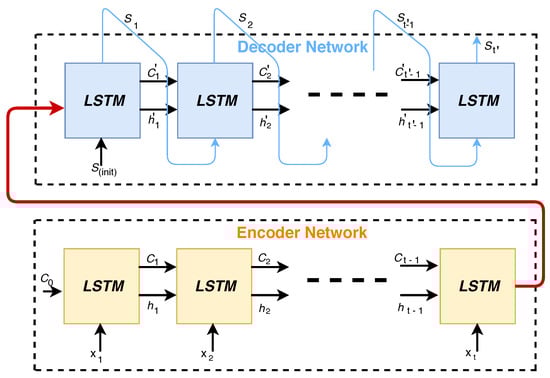 In LSTM-based encoder–decoder models, the encoder part compresses the information from the entire input sequence into a vector composed of the sequence of the LSTM hidden states. Consequently, the encoder summarizes the whole input sequence () into the cell () and memory () state vectors and passes them to the decoder [29]. The latter uses this representation as initial state to reconstruct the time series (). The architecture employs two LSTM networks called the encoder and decoder, as shown in Figure 1.