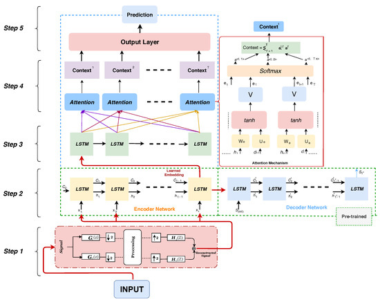 At first (Step 1), a denoising filter is applied to the input data, composed of the former stem diameter values and the respective environmental parameters. The filter is based on the Wavelet Transform (WT) of the input data, removing the WT high frequency component, and generating a smoothed version of the input data [50]. The ED model is then applied (Step 2). The encoder is pre-trained to extract useful and representative embeddings from the reconstructed time series data. A two-layer LSTM (128 and 32 neurons, respectively) is used in the encoder shown in Figure 1. The decoder learns to generate the (reconstructed) input signal from the embeddings, thus optimizing this feature extraction procedure. Then, the LSTM network, with 128 neurons (Step 3), with an attention mechanism (Step 4), is trained to model respective long-term dependencies, using the learned embedding as input features. A single layer neural network (Step 5) provides the final one-step, or multi-step ahead prediction provided by this WT-ED-LSTM-AM architecture.
