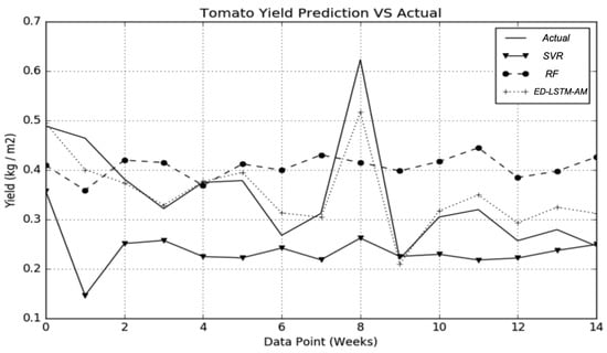 The experimental study on these data illustrated the ability of the above-described ED-LSTM-AM model (WT did not provide any significant improvement in this case) to provide accurate prediction of tomato yield. Figure 5 shows that this model outperforms standard ML methods, including SVR and RFR, in tomato yield prediction. The MSE in actual yield prediction was 0.015 for SVR, 0.040 for RFR and only 0.002 for ED-LSTM-AM.