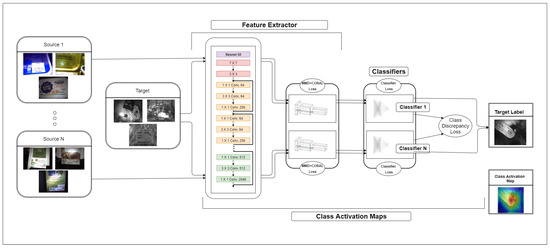 - Ganin, Y.; Lempitsky, V. Unsupervised Domain Adaptation by Backpropagation. In Proceedings of the 32nd International Conference on International Conference on Machine Learning—Volume 37, JMLR.org, ICML’15, Lille, France, 6–11 July 2015; pp. 1180–1189. [Google Scholar]