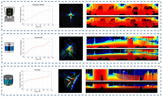 Different types of LiDAR have different settings for elevation angles. Therefore, the range images generated by PBID and PBEA may be significantly different. This figure shows three types of LiDAR and the range images they generate. From left to right: The LiDAR itself; the elevation angle for each laser beam; the 3D point cloud generated by the LiDAR; range image generated by the approach of PBID (top) and PBEA (bottom).