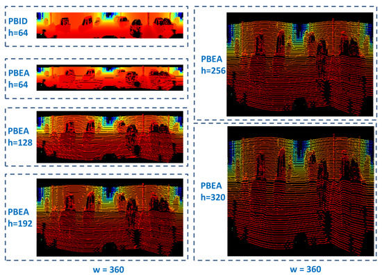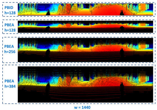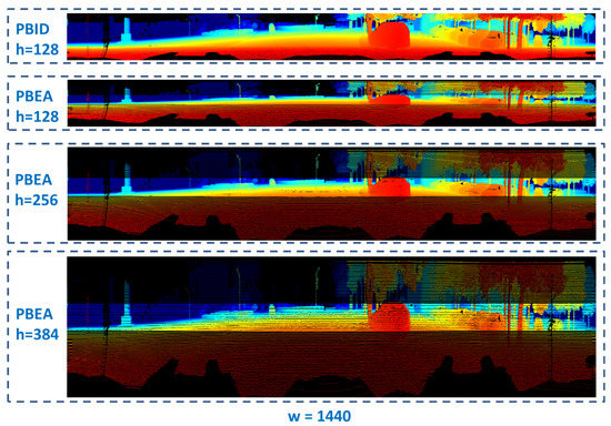 Two representative frames are selected from KITTI odometry sequence 07 dataset. One is frame 700 when the vehicle speed is 0, and the other is frame 789 when the vehicle speed is around 43 km/h. For both frames, the range image width w and the range image height h are set to different values. An illustrative example of the range image generated by PBID and PBEA under the parameter settings of is shown in Figure 3.