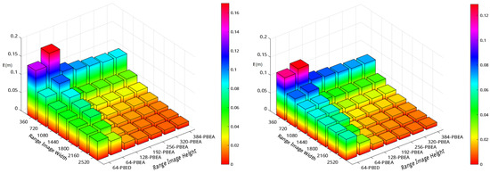 Quantization error under different settings of range image width and height. For PBID, the range image height has to be set to the number of LiDAR channels, i.e., 64 for the Velodyne HDL64. For PBEA, the range image height can be set to different values. The image on the left is the result of frame 700 when the LiDAR is stationary, and the image on the right is the result of frame 789 when the LiDAR is moving.