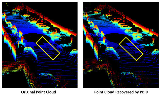 The left figure shows the original point cloud, and the right figure shows the recovered point cloud after the PBID projection. As highlighted in the yellow rectangle region, the planar ground surface in the original point cloud becomes no longer flat after the PBID projection. Points are colored by height.