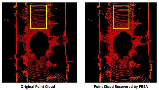 The left figure shows the original point cloud, and the right figure shows the recovered point cloud after the PBEA projection. As highlighted in the yellow rectangle region, the continuous line segments become no longer continuous after the PBEA projection.