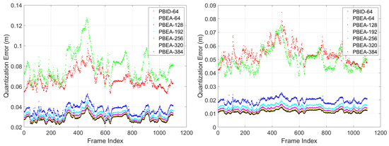 We then perform experiments on the whole KITTI odometry sequence 07 dataset. It contains 1101 scans in total. The range image width is set to 1080 or 2160. The quantization error for the entire sequence is shown in Figure 8. It can be seen that the performance of ‘PBID-64’ is on par with ‘PBEA-64’ (PBEA approach with range image height set to 64), and much worse than ‘PBEA-128’. As the height of the range image increases, the quantization error continues to decrease.