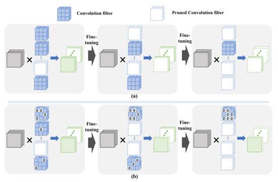 By the elimination of weight parameters or filters, the size of a deep learning model can be reduced effectively. Accordingly, it can accelerate the speed of inference computation thanks to the reduced model parameters/filters [6,7,9,10,11]. Furthermore, it has been revealed by Han et al. [12] that the pruning model can even be expected to improve accuracy performance through fine-tuning.
