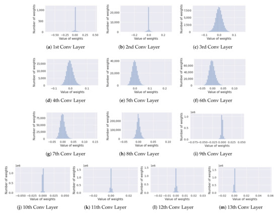 The distribution of weight parameters in each layer of a pre-trained model (VGG-16).