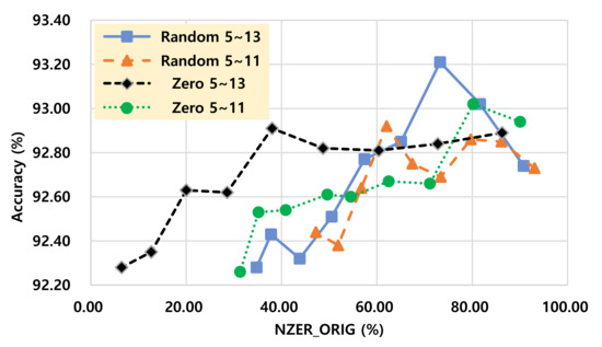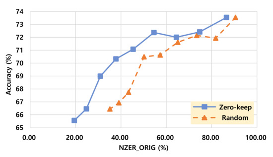 In Figure 3 and Figure 4, if two models have the same level of accuracy, then a model with fewer non-zero elements can be expected as a more efficient model in terms of computational complexity because less multiplication operations are performed. In those figures, a “Random 5-13” configuration shows the best efficiencies among the configurations with random pruning while a “Zero 5-13” configuration shows the best efficiency among the configurations with zero-keep pruning.