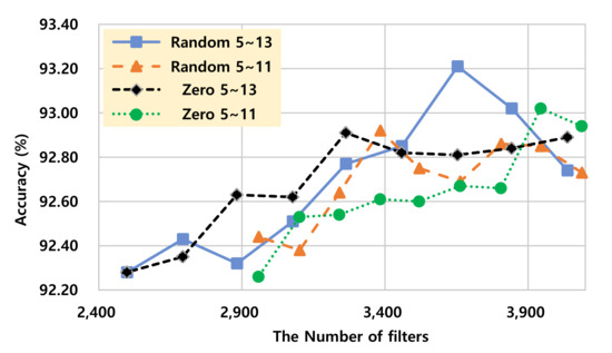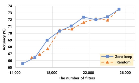 A graph showing “accuracy versus non-zero element rate trade-off” for the two pruning methods (random filter pruning and zero-keep filter pruning) is presented in Figure 5. In the graph, the model of pruning filters on the layers from 5th to 13th using our zero-keep pruning is the most efficient at certain accuracy ranges (“Zero 5-13” is evaluated as the most efficient scheme at the accuracy range from 92.9 to 92.20). Furthermore, in Figure 6, we can find that zero-keep pruning is also efficient in terms of the number of filters in some accuracy ranges. “Zero 5-13” has smallest number of filters at the accuracy range from 92.9 to 92.5. That leads to the lowest computation requirement since the lower number of filters implies a lower number of matrix multiplications. Our zero-keep pruning usually has similar accuracy with fewer filters when compared to random pruning. However, in some cases of pruning a only small number of filters, random running shows better accuracy performance than the proposed zero-keep pruning.
