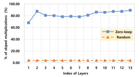 Figure 9 shows the estimated percentage of the skipped multiplications among the total number of multiplications. As you can see in the figure, in the proposed zero-keep pruning, 82% of multiplications in average over all the convolution layers can be skipped while less than 4.1% of multiplications are only skipped in typical random pruning. Compared to the random pruning, 19.9 times more multiplications can be skipped for accelerating performance and saving power/energy consumption. However, the benefits of the actual time performance and power/energy consumption can be evaluated with the detailed hardware design and implementation of all the deep learning models in ASIC or FPGA. Recently, hardware architectures for exploiting zeros in filters and feature maps have been proposed and designed to improve the efficiency of deep learning accelerators [27,28]. Such hardware architecture can work very efficiently with the proposed approach since our approach maximizes zeros in filters.