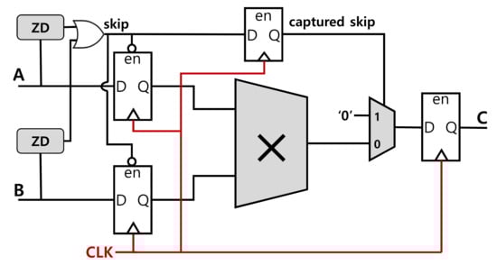 Figure 11 shows the timing simulation results for the proposed zero-skip multiplier. In the waveform, two input signals, A and B, are represented by the signals, a[31:0] and b[31:0]. The output signal, C, is represented by c[31:0]. If both of the input signal values are not zero, then typical multiplication happens. However, when any of the two inputs are zero (Case 1: A = B = 0 and Case 2: B = 0 in Figure 11), zero detection circuits detect a zero value (ZD_a for A and ZD_b for B) and the “captured_skip” signal goes high. When the “captured_skip” signal is high, there is no switching for the multiplications and the multiplier keeps the previous output (mul_result_comb) as a result. Although the multiplier keeps the previous output in those cases, the actual output becomes zero because the captured_skip selects ‘0’ as an output by controlling the two input MUXs given in Figure 10. The simulation was conducted with a Xilinx Vivado design tool (post-implementation timing simulation with the device setting of a Kintex-7 FPGA).
