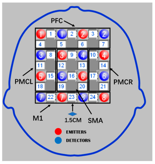 This study used the internationally recognized 10–20 system as the positioning standard to locate brain functional areas. The experiment designed a 4 × 4 headgear layout to detect the above key functional areas. There were a total of 24 effective test channels. The overall headgear layout is shown in Figure 3. In the layout, the Cz point was used as a reference point for the relative position, and the distance between Cz and the center of the 23rd channel was 1.5 cm. The entire layout can cover four brain functional areas: PFC, SMA, PMC (PMC = PMCL + PMCR), PMCR, and M1 brain area function [11].
