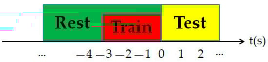 In the exercise state classification task, the goal was to recognize the exercise intention before the real action. Therefore, it was necessary to extract the data of the real pre-exercise time period for analysis. The training time period selection method is shown in Figure 4. Took the starting point of the real action as the reference point (0), took the signal from −3 s to 0 s as the training time period, and applied the sliding time window method. The length of the window was set to 20. The overlapping length of two adjacent sliding windows was three sampling points. Then, we calculated the features within the time window to obtain the feature data set.